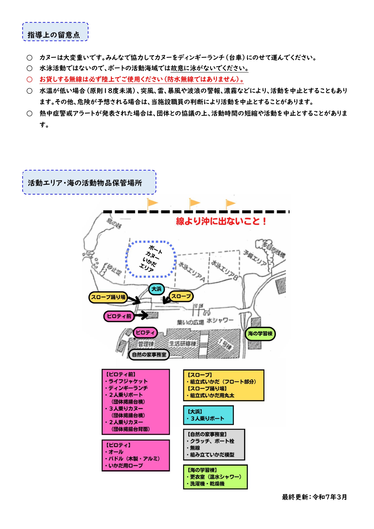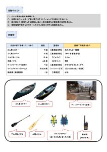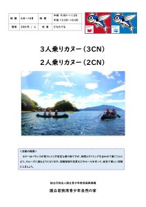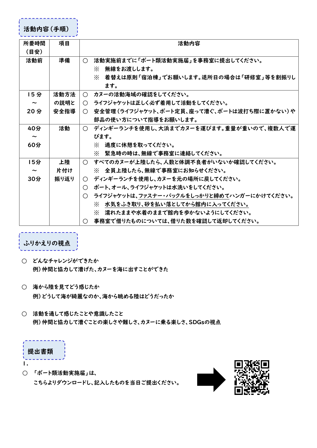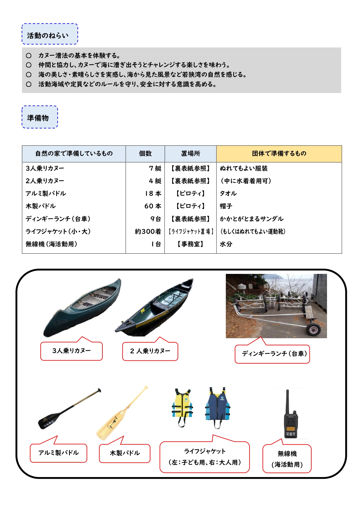 ・カヌー漕法の基本を体験する。 ・仲間と協力し、海にチャレンジする楽しさを味わう。 ・海の美しさ・素晴らしさを実感し、海から見た風景など若狭湾の自然を感じる。 ・活動エリアや定員などのルールを守り、安全に対する意識を高める。自然の中での活動を通して、自然を身近に感じ、その大切さや恵みについて考える。 |