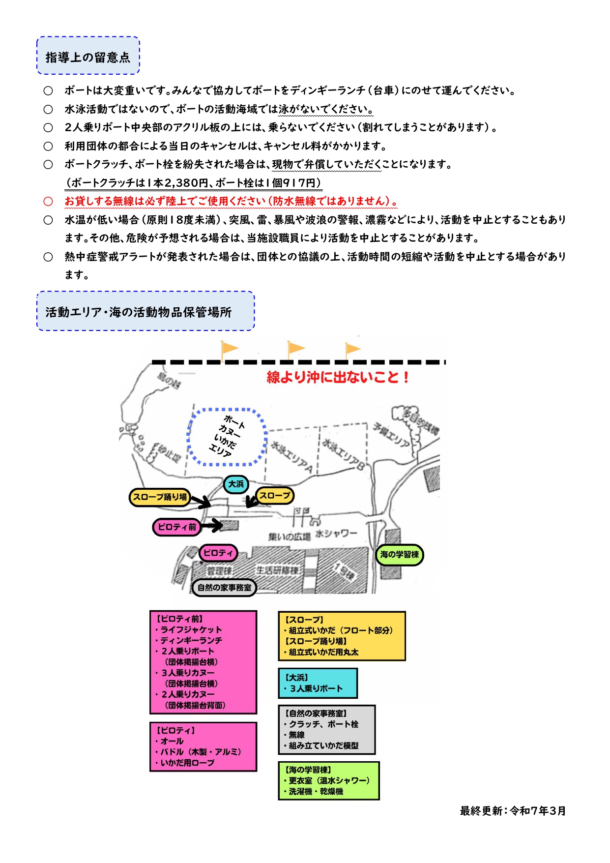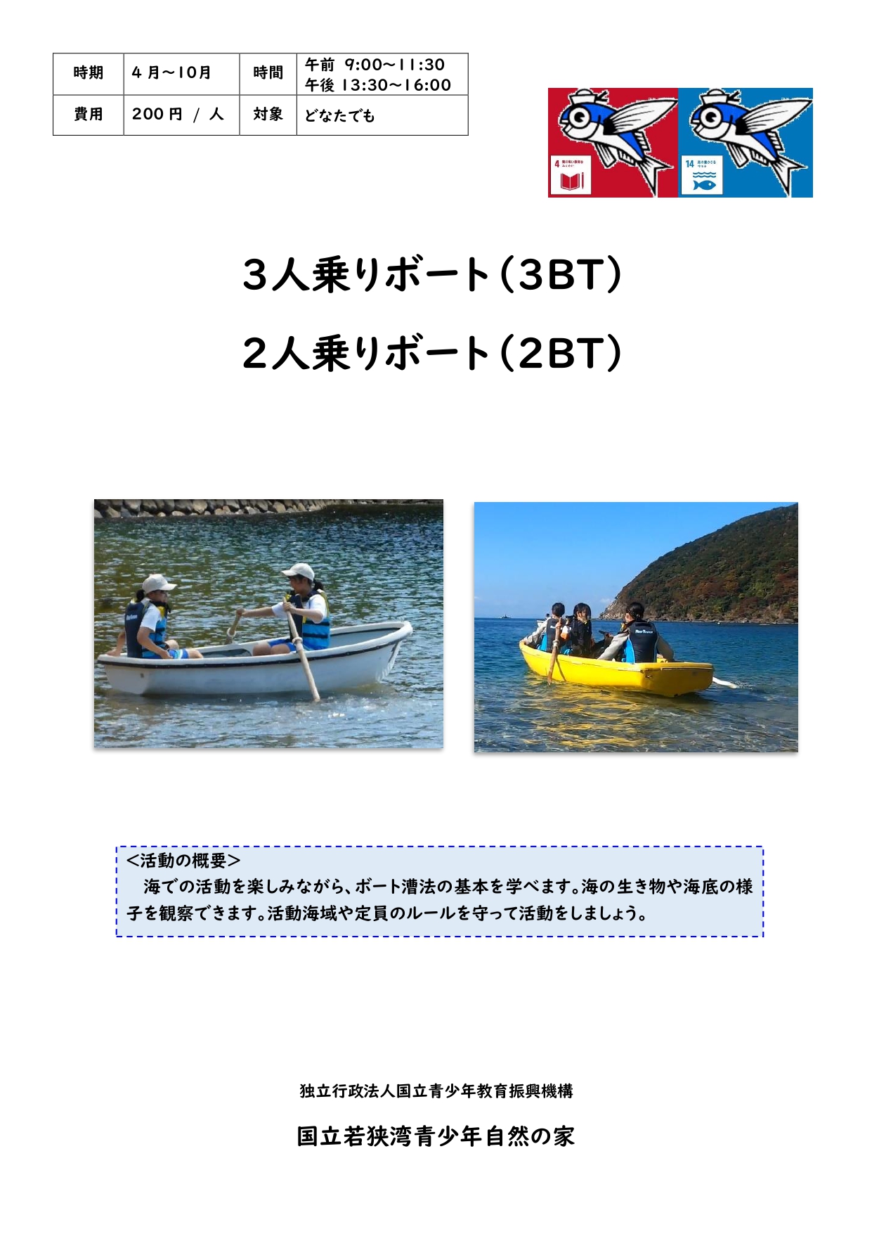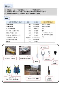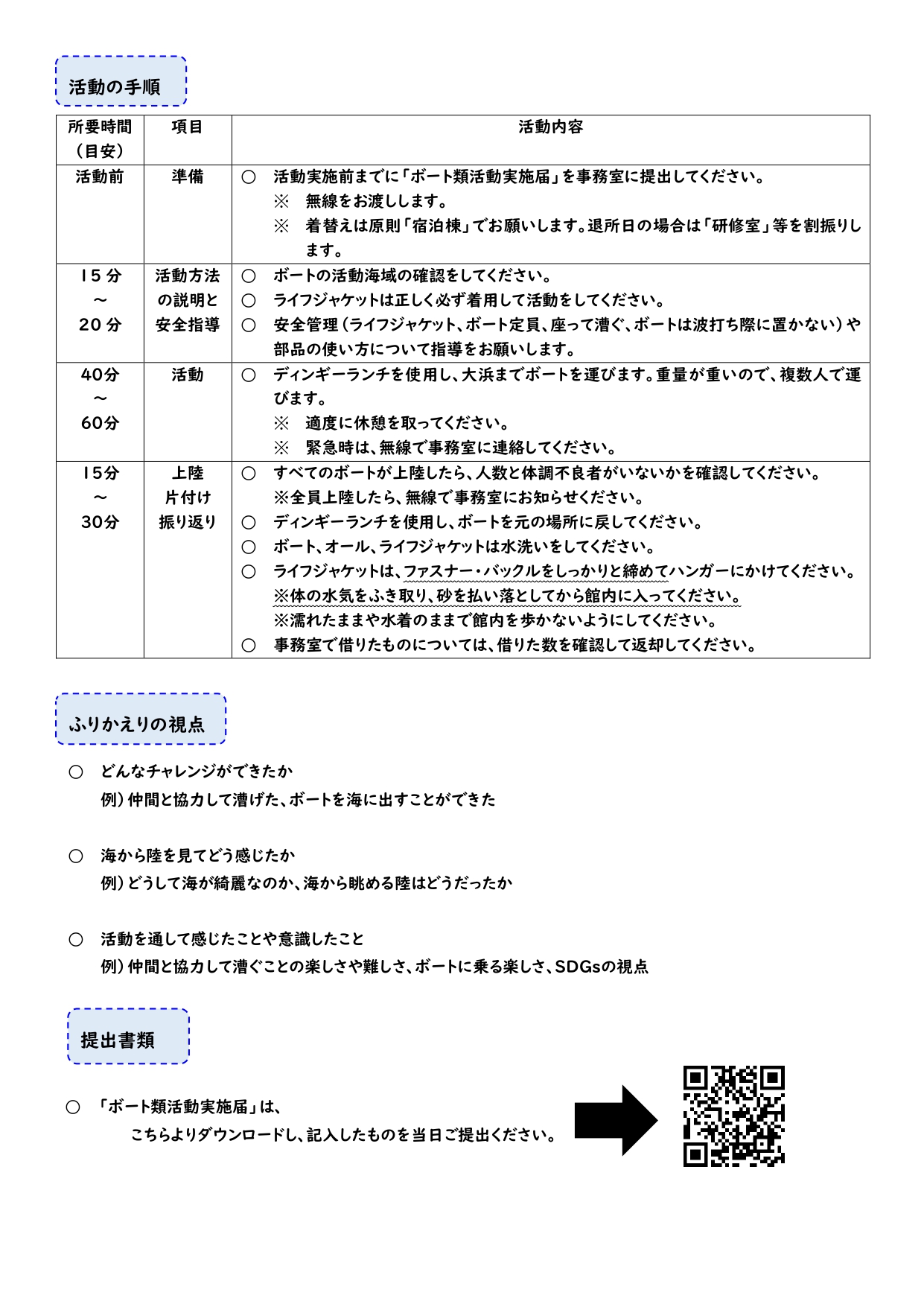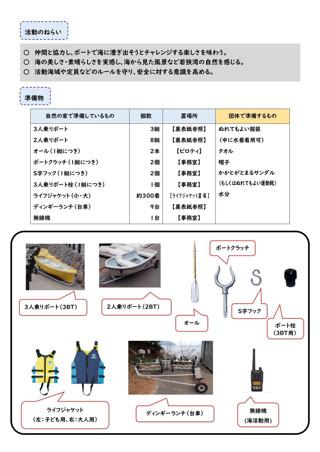 ・仲間と協力し、海にボートを出し海にチャレンジする楽しさを味わう。 ・海の美しさ・素晴らしさを実感し、海から見た風景など若狭湾の自然を感じる。 ・活動エリアや定員などのルールを守り、安全に対する意識を高める。 |