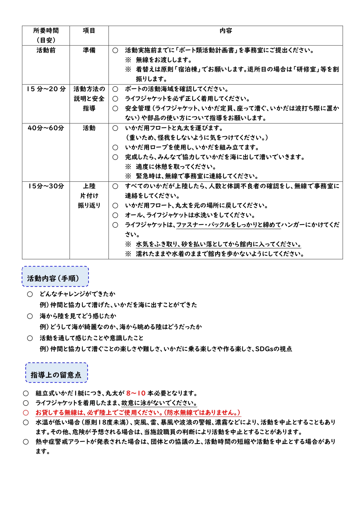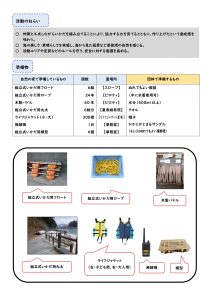 ・仲間と工夫しながらいかだを組み立てることにより、協力する力を育てるとともに、作り上げたという達成感を味わう。 ・海の美しさ・素晴らしさを実感し、海から見た風景など若狭湾の自然を感じる。 ・活動エリアや定員などのルールを守り、安全に対する意識を高める。 |