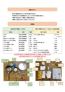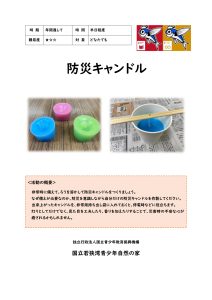 ・防災の意識を高め、もしもの時の備えを考える。 ・防災時の灯りの必要性を知り、キャンドル作りの意欲を高める。 ・仲間の作品を互いに鑑賞し、理解を深めあう。 ・準備から後片付けまで、協力してやりとげる。 |