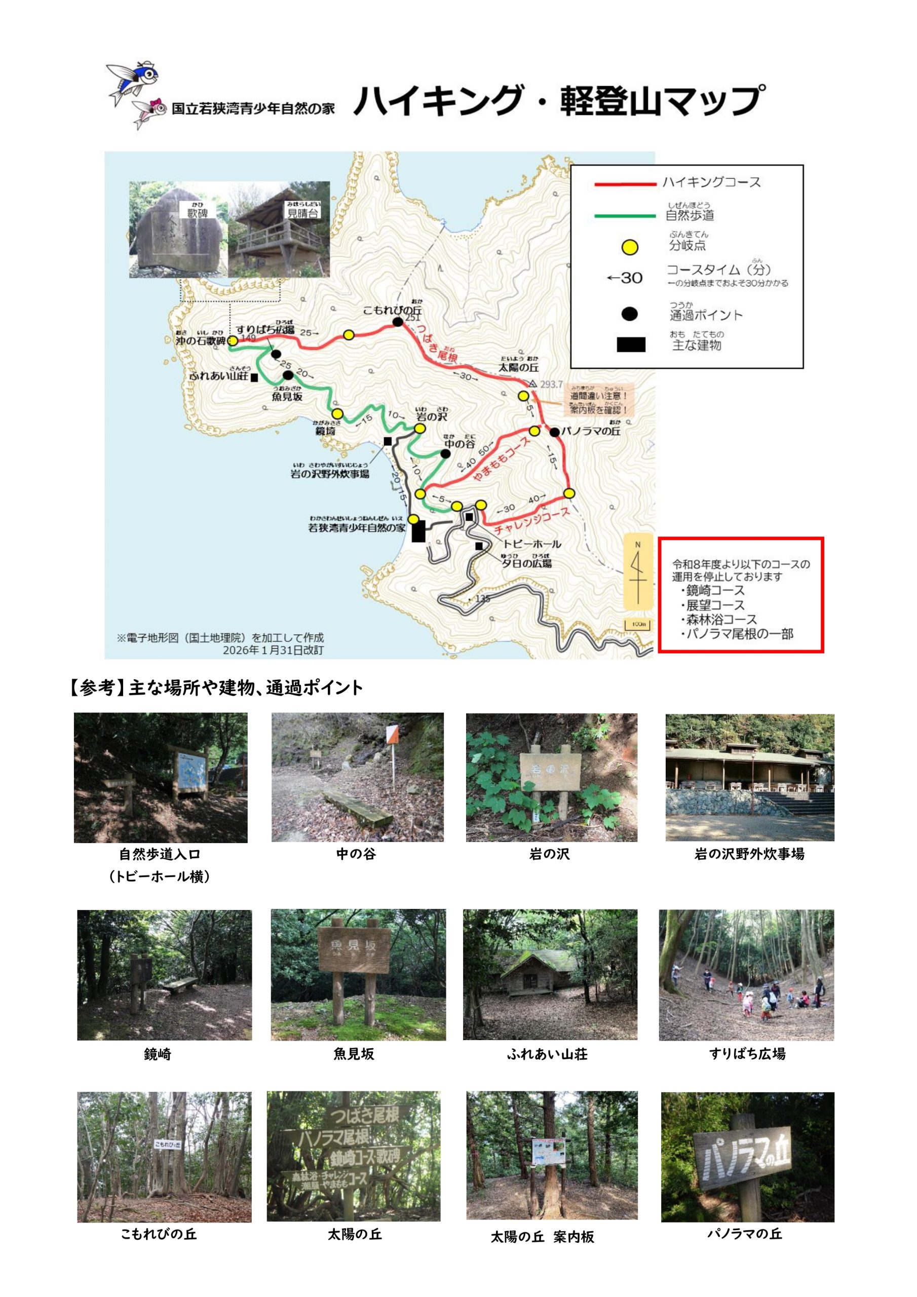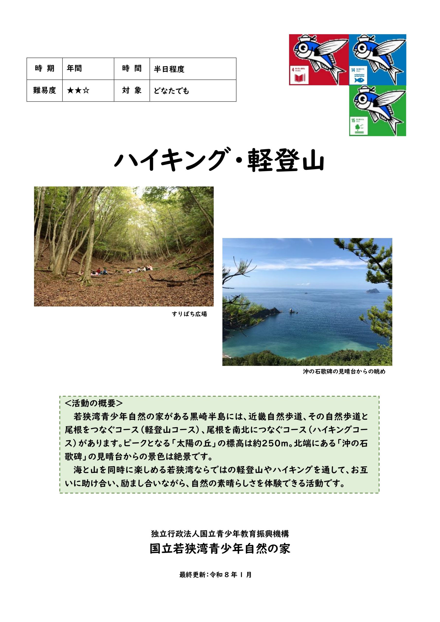 若狭湾青少年自然の家がある半島一帯には、ハイキングコースと、それらを繋ぐ自然歩道・つばき尾根・パノラマ尾根があります。ピークとなる「太陽の丘」までの高低差は約250mで、「沖の石歌碑」からの景色は絶景です。