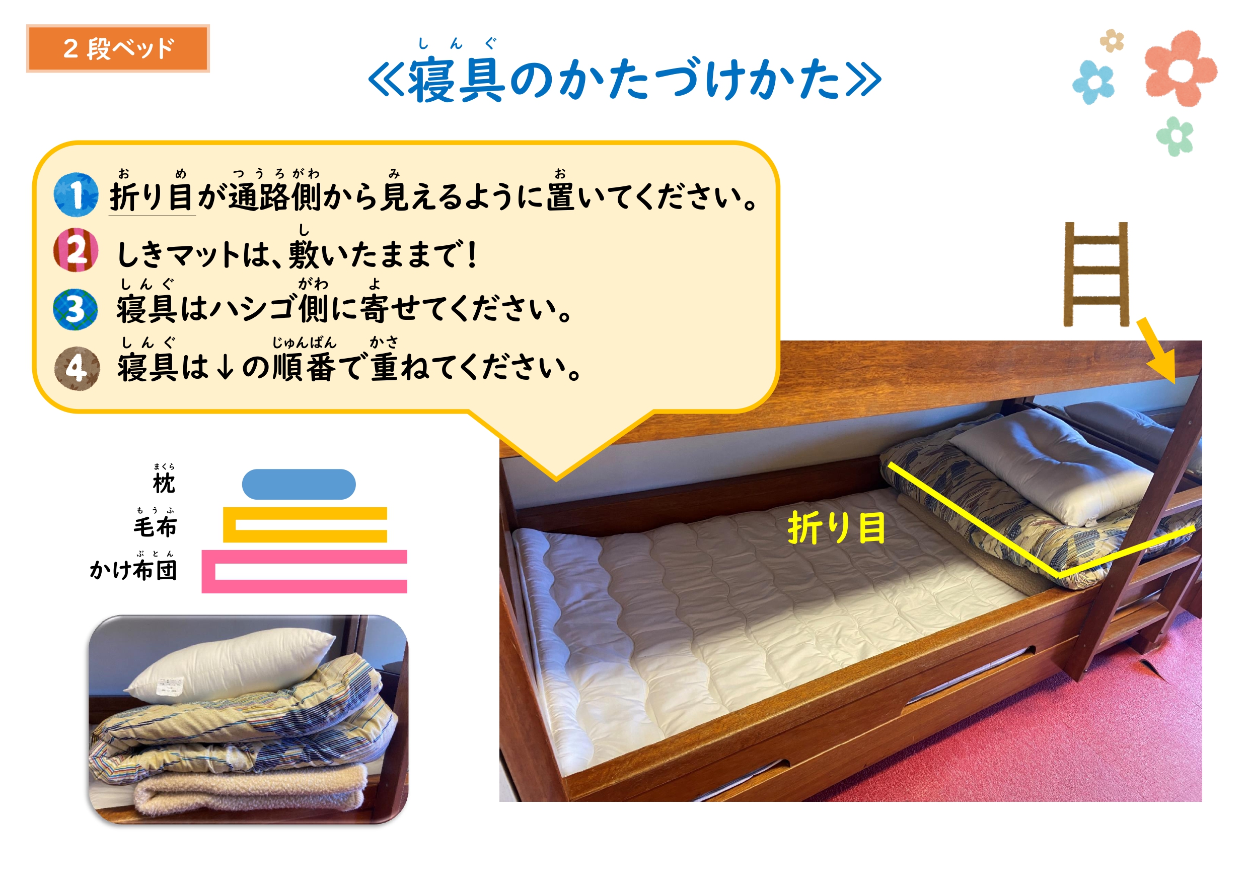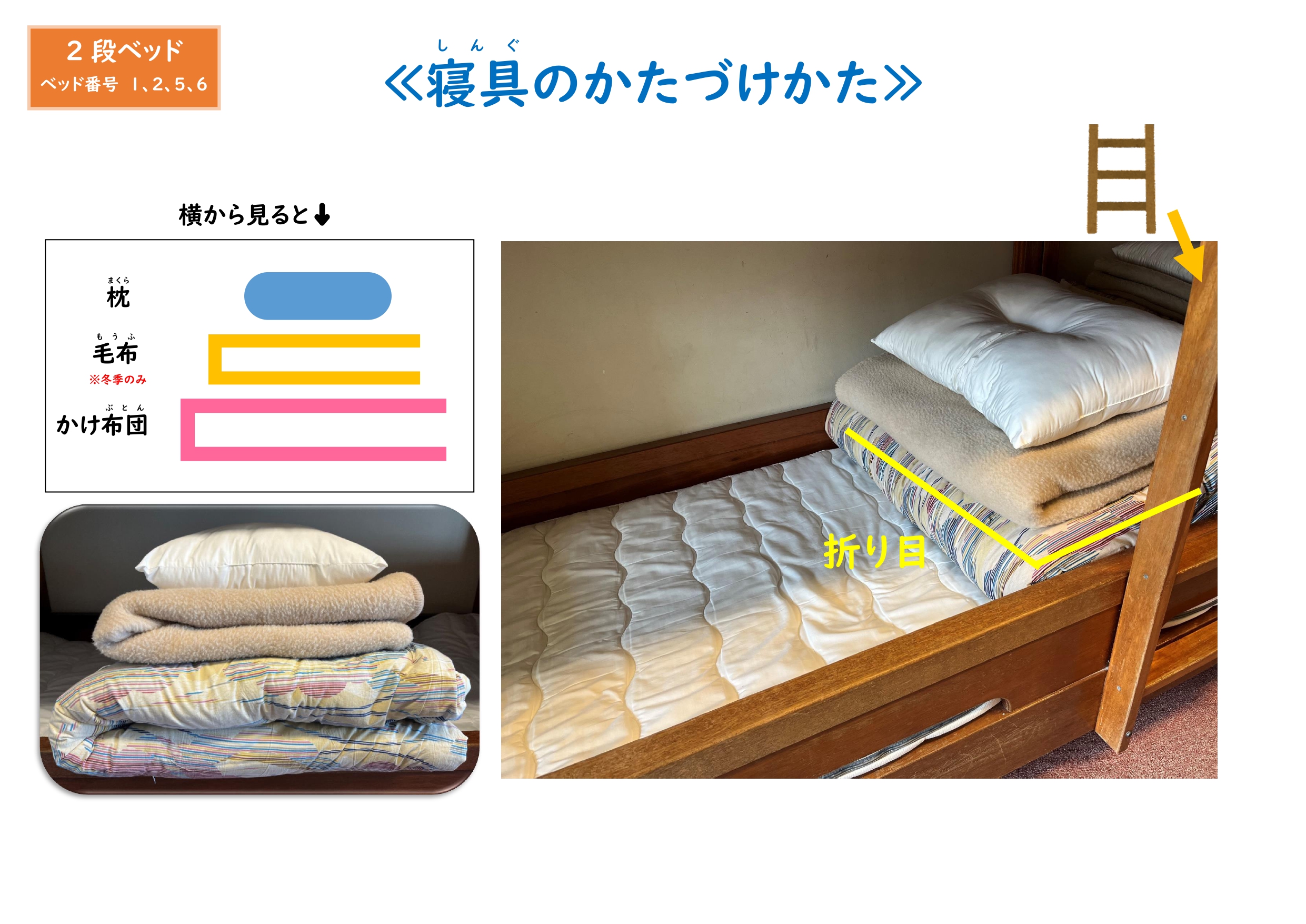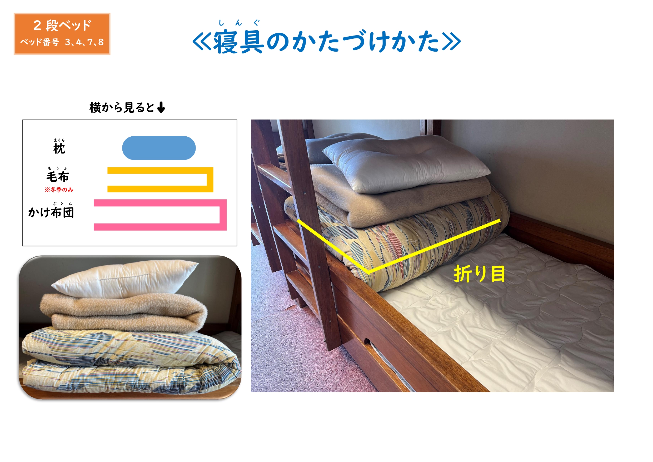 | ふとんのかたづけ方 ※各宿泊室に掲示している資料です 「毛布なし」…おおむね6月~9月 「毛布あり」…おおむね10月~5月 |