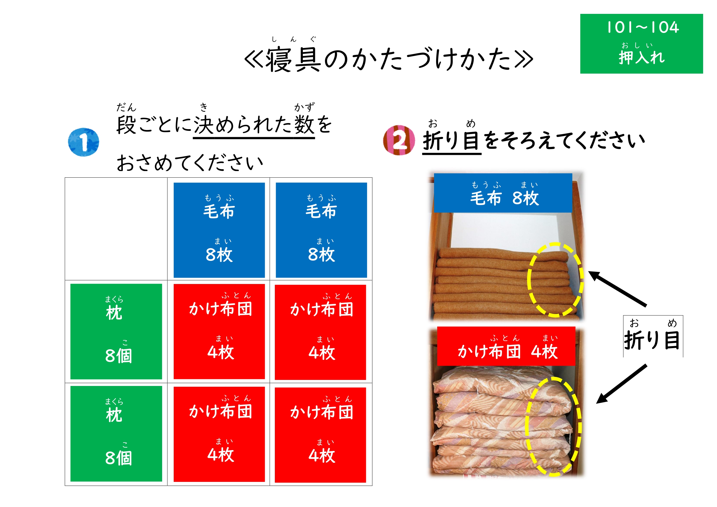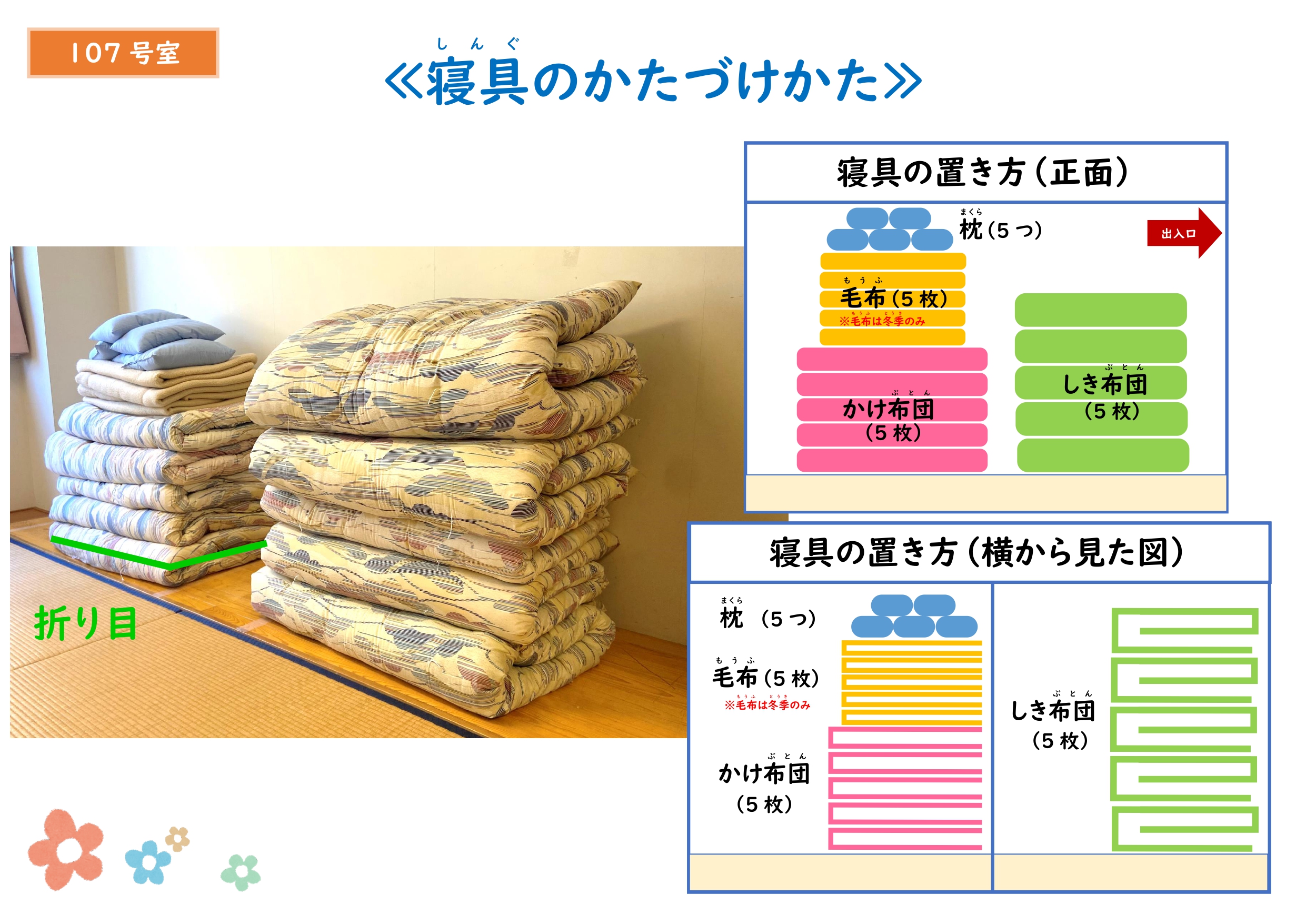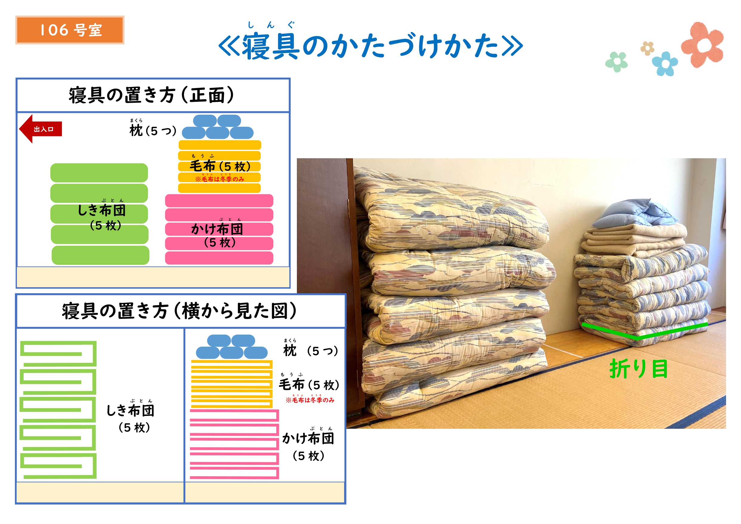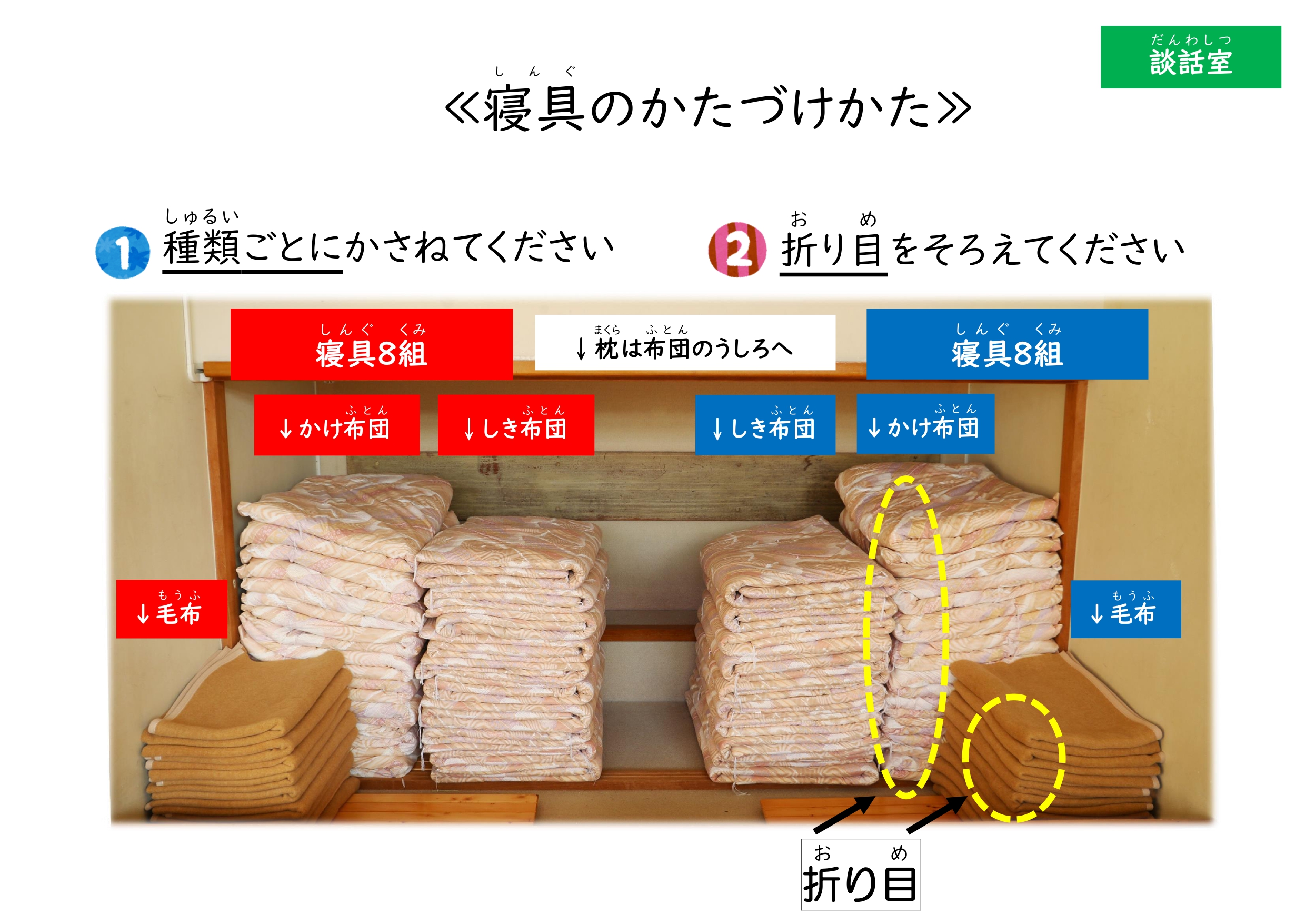 | ふとんのかたづけ方 ※各宿泊室に掲示している資料です 「毛布なし」…おおむね6月~9月 「毛布あり」…おおむね10月~5月 |