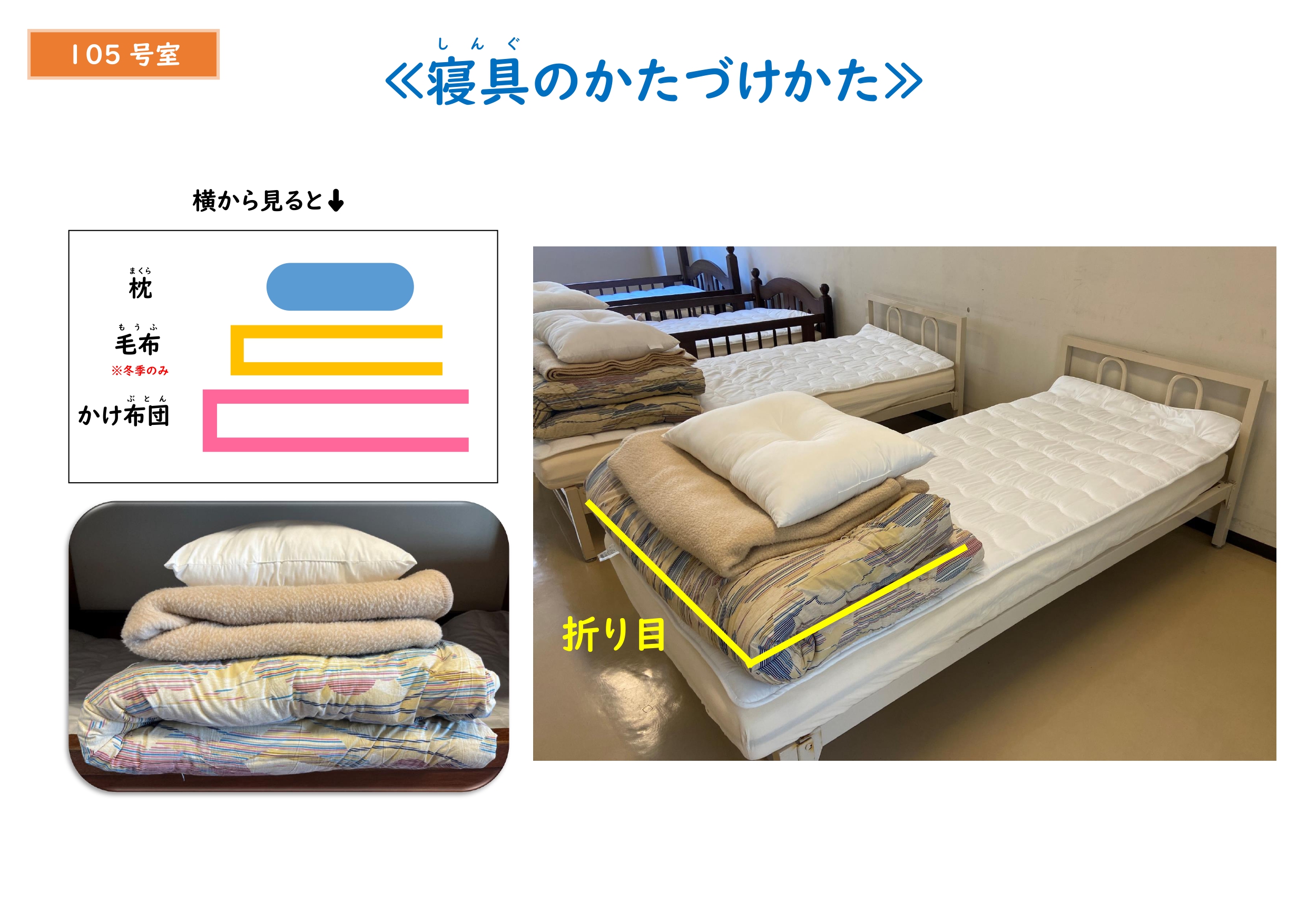 | ふとんのたたみ方 ※各宿泊室に掲示している資料です 「毛布あり」…おおむね10月~5月 |