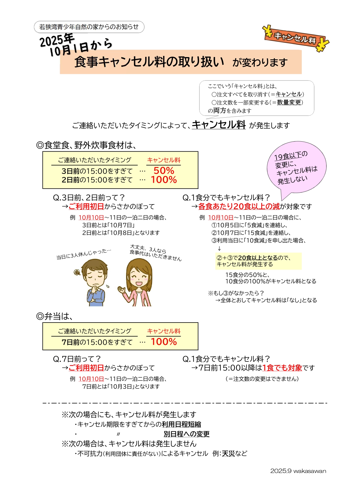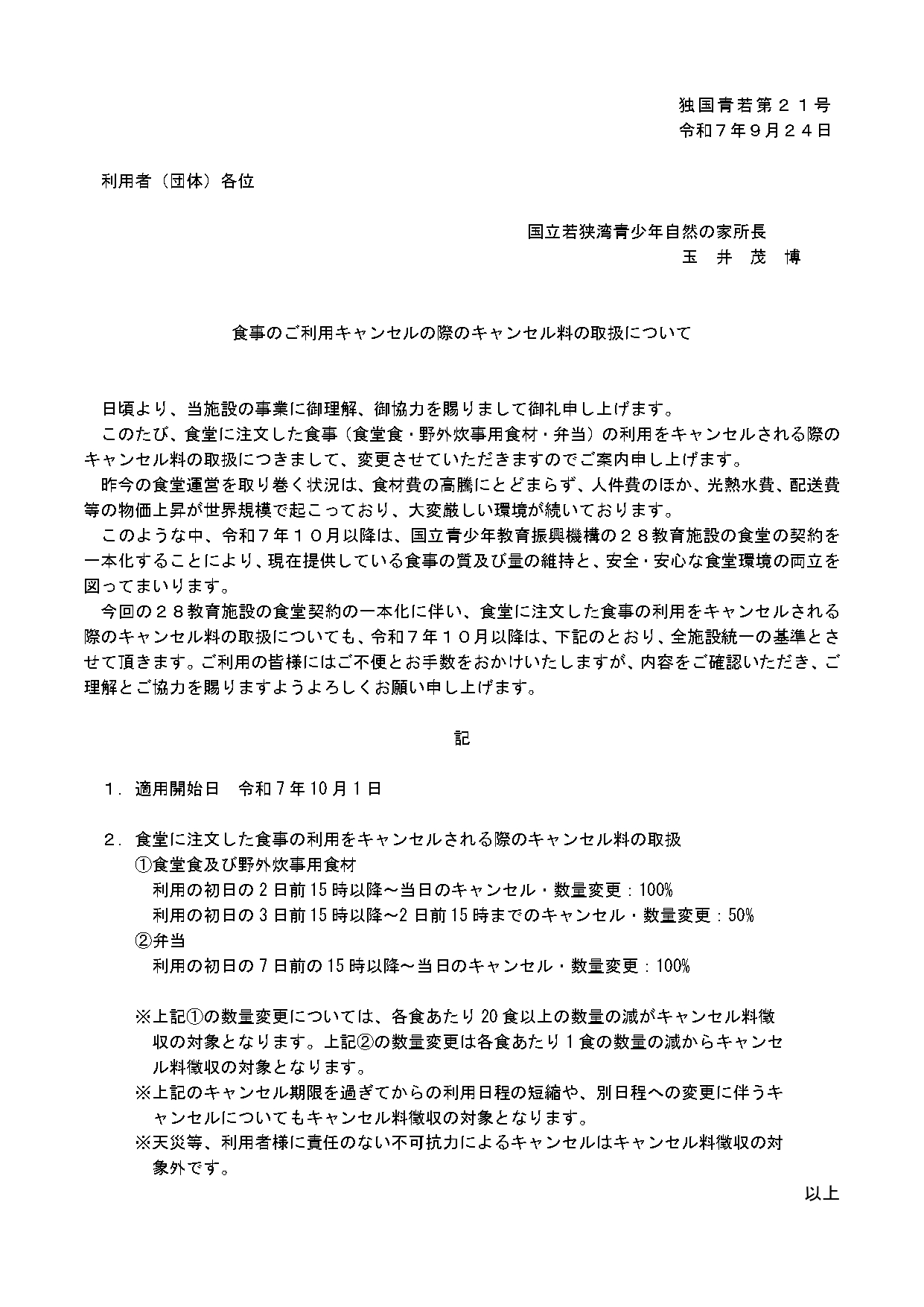 令和7年10月1日から、食事の御注文キャンセルの際のキャンセル料の取扱について別紙のとおり改定いたします。